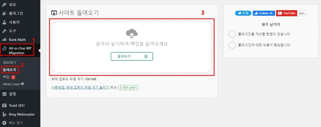All-in-One WP Migration으로 복원하는 법은 너무 쉽다. 아래 번호 순서에 따라 클릭해서 화면 띄워 놓고 앞서 백업했던 파일을 그냥 드래그 앤 드롭으로 올려놓으면 끝.